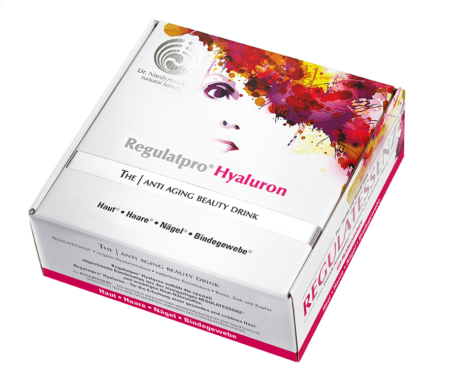 Neu: Anti-Aging Beauty DrinkSpieglein, Spieglein an der Wand, wer ist die Schönste im ganzen Land? Der Anti-Aging Beauty Drink von Dr. Hans Niedermaier, angereichert mit hochdosierter Hyaluronsäure wird täglich als Kur getrunken. Ihr Erfolgsgeheimnis für die ultimative Schönheit von Innen. Endlich kann man Jugend trinken! Die Hyaluronsäure verhält sich wie ein Schwamm im Unterhautgewebe, speichert in erheblichen Mengen Feuchtigkeit und "bügelt" die Haut von innen heraus faltenfrei auf. Ist das Bindegewebe ausreichend versorgt, ist die Haut wieder wie neu: glatt, strahlend und weich. In einer aktuellen Studie des unabhängigen Forschungsinstituts Dermatest Münster wird gezeigt, dass Regulatpro® Hyaluron folgendes bewirkt: